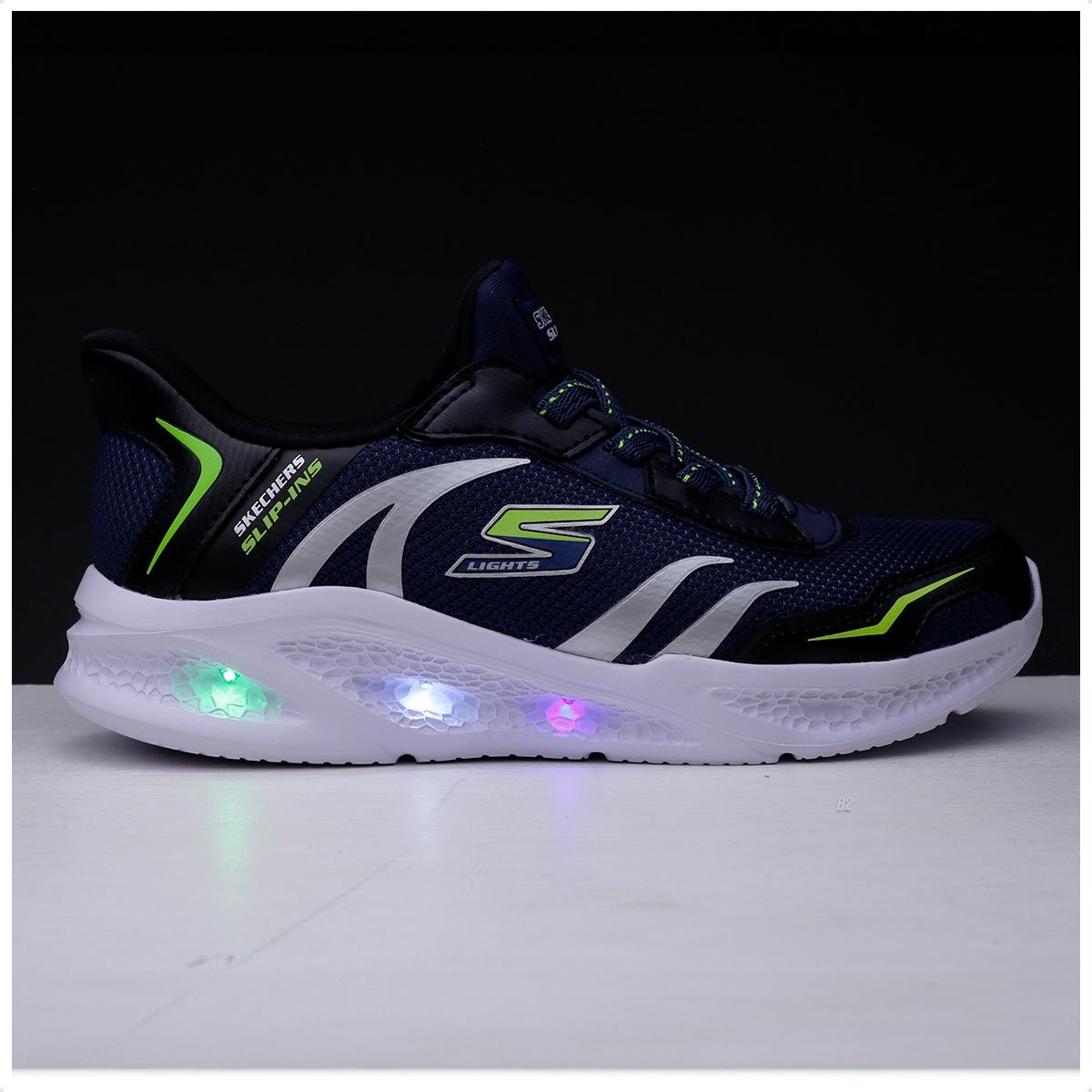 Transforme cada passo em diversão com o Skechers Hands Free Slip-ins® S-Lights®: Meteor Lights – Brisk-Beams.Com luzes integradas na entressola e design esportivo moderno, este modelo traz o combo perfeito para acompanhar a energia das crianças: conforto, praticidade e muito brilho.A tecnologia Hands Free Slip-ins® permite calçar sem usar as mãos, enquanto o Heel Pillow® mantém o pé firme por dentro do tênis.O cabedal mescla mesh respirável com detalhes metalizados, deixando o visual ainda mais estiloso.Para completar, a palmilha Air-Cooled Memory Foam® oferece conforto imediato e macio a cada passo.É fácil de calçar, confortável para brincar e cheio de luz — literalmente!