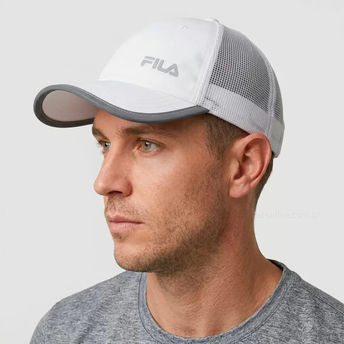 Na parte traseira, o modelo possui logo FILA Letter bordado, reforçando a identidade da marca. O ajuste é feito por fechamento com regulador de plástico, permitindo adaptação segura e confortável para diferentes tamanhos.