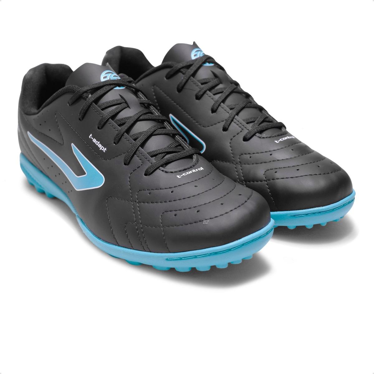 O solado de borracha conta com pequenas travas estrategicamente posicionadas, garantindo excelente aderência ao gramado artificiais.